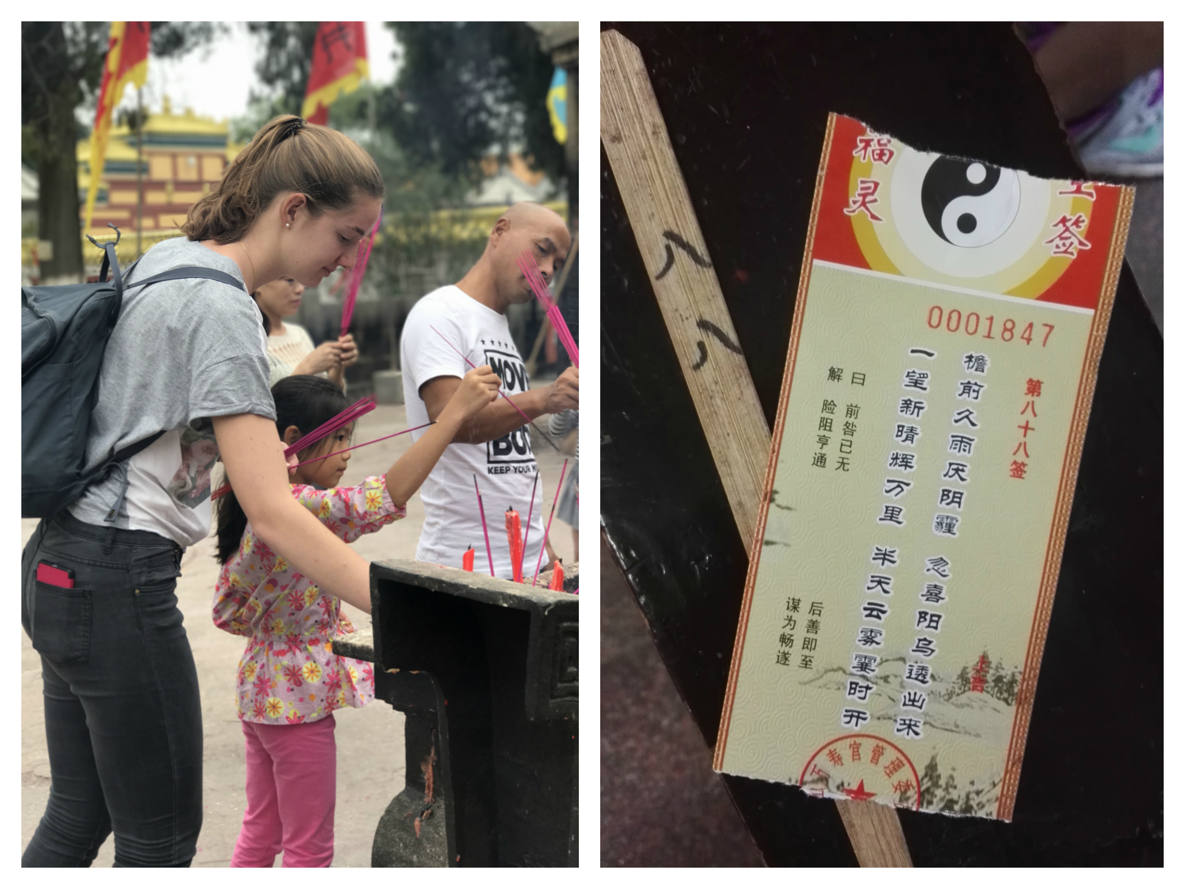 In the afternoon we went to the Wanshougong temple outside of the city, which was less a touristic attraction but more of a cultural experience. It is a temple of the Taoism and people come there to pray. People go there to light joss sticks and ask for protection for their beloved ones. We also went to a kind of fortune teller and I got the number 88, which he told me will bring me a lot of luck!