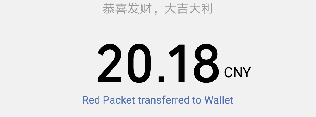 This is one Hongbao I recieved with the amount of 20.18 Yuan. The message 恭喜发财,大吉大利 congratulates you to the new year and wishes you to make I fortune in the next year.