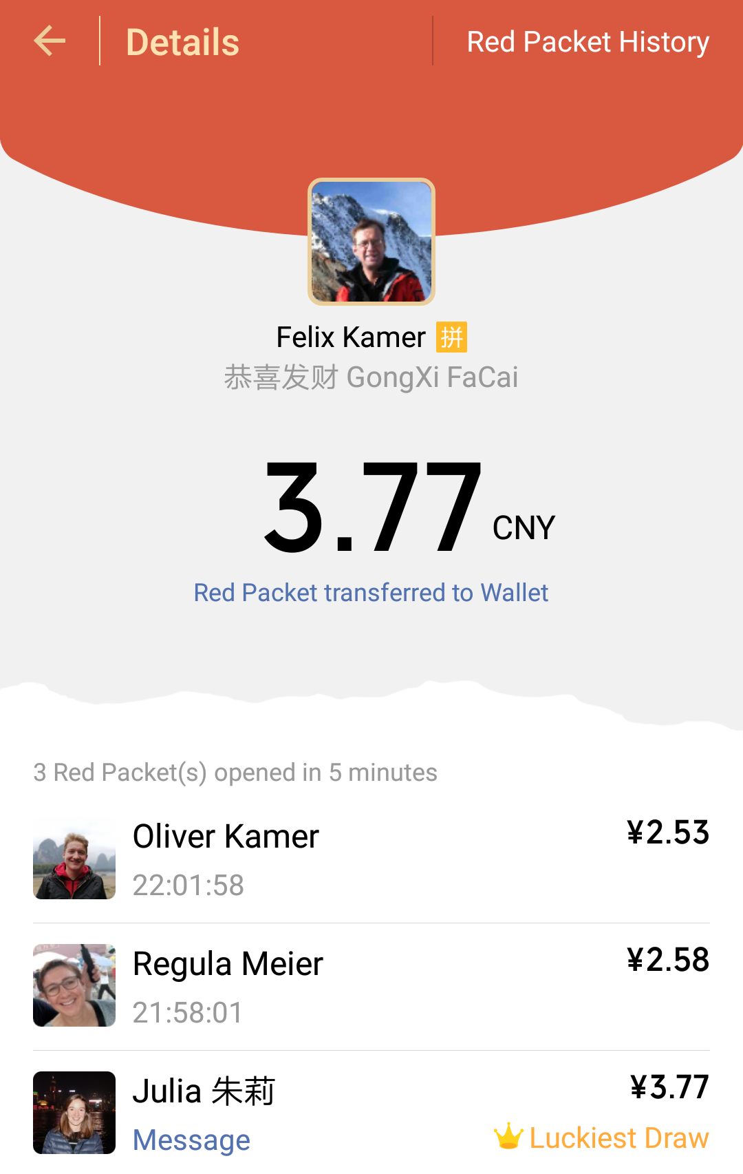 But even better is that you can send a Hongbaos to a Wechat group. You can enter an amount of money and then it gets distributed randomly to all people that open it (usually the people that open first recieve more money). And because if you open a Hongbao you should also send one, this evolves to a Hongbao Party in the Wechat group.